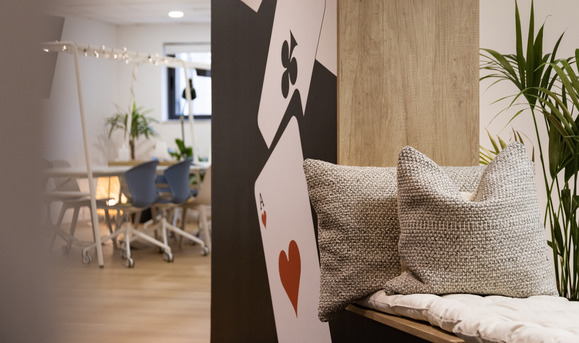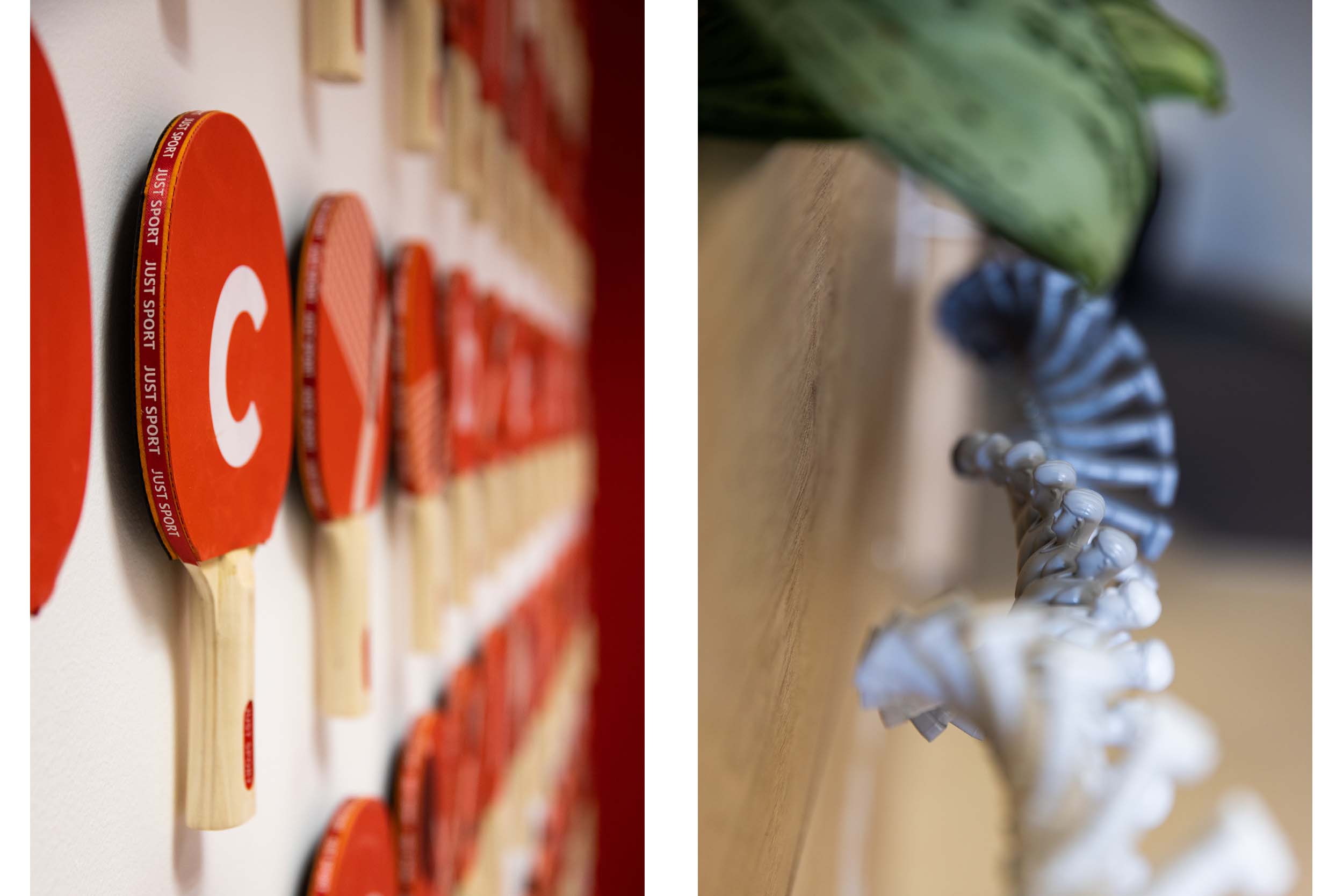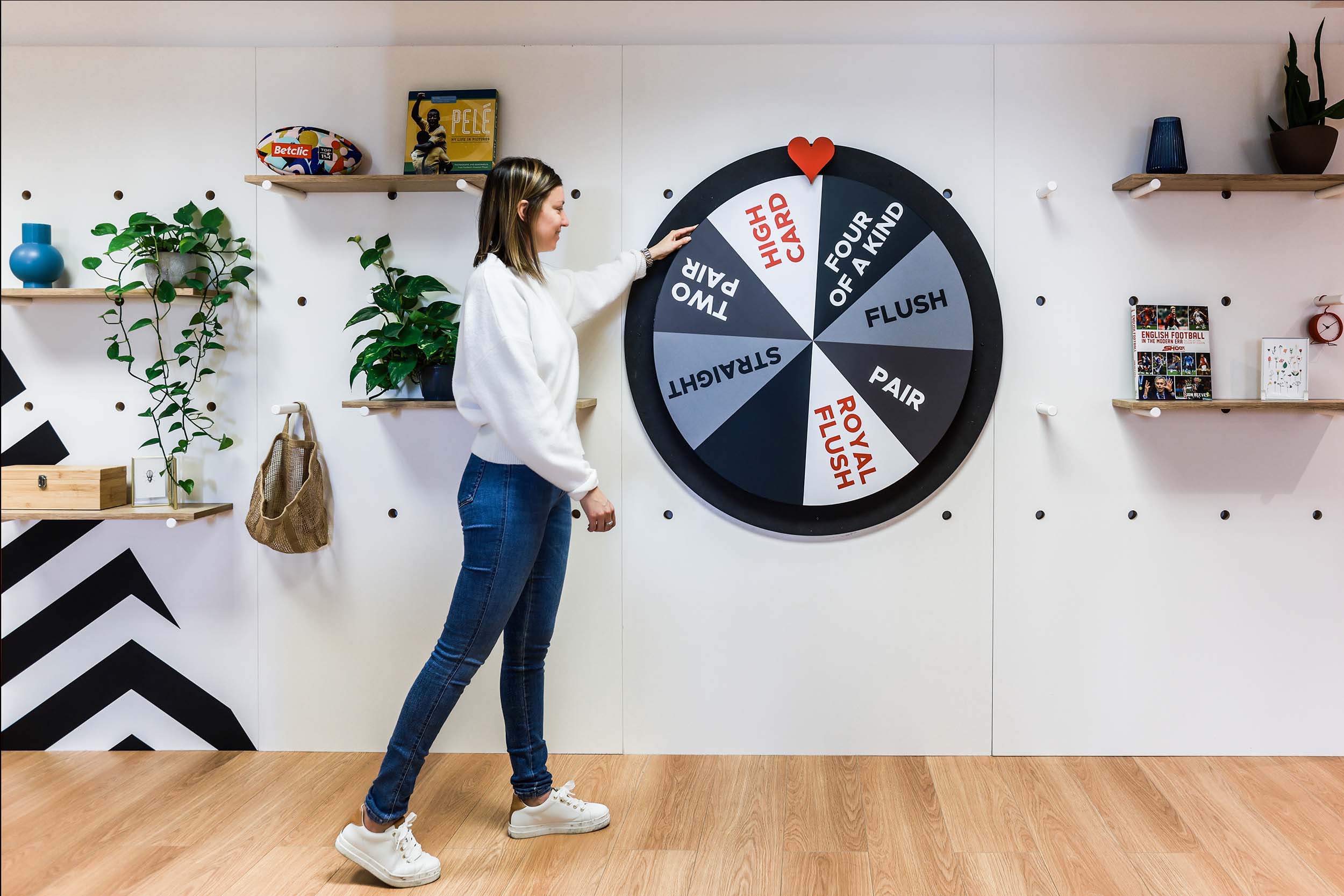 Why have room dividers when you can have a custom laser cut piece that takes the pattern of a net when hit by a ball? Why have a logo on a wall, when each letter of that logo could be printed on table tennis bats? Why have sports photos on the wall when your team scarves branded with Betclic colours could be hung from the walls? Prints of a deck of cards on the walls or interactive artwork where you become the King or Queen of Diamonds, with just a simple cleverly positioned mirror. Why divide space with basic lockers, when those lockers and closets could take on the names and numbers of sporting heroes? Why not choose your own poker hand with a ‘spin the wheel’ feature to help keep your mind on the game?